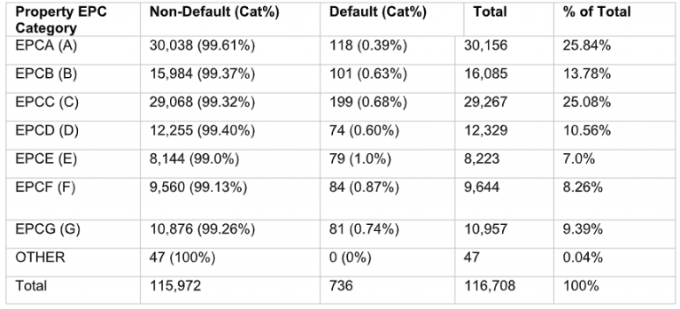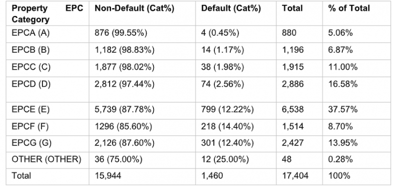 The pattern of default risk follows a clear upward trajectory as efficiency declines: properties rated A and B record the lowest proportion of defaults (around 1%), while those rated F and G reach 1.8-2.0%, and poorly classified “other” properties default at exceptionally high levels (87%).